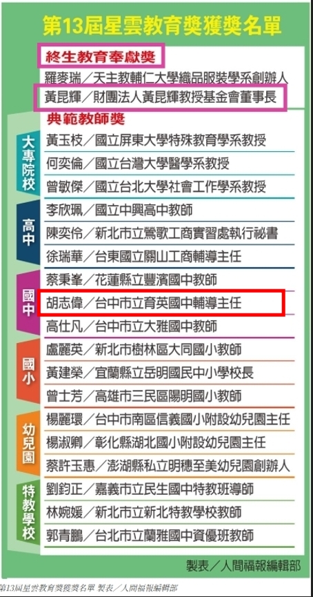 44級黃昆輝校友推動前瞻性改革,為台灣教育奠定現代化基礎,獲頒第13屆星雲教育獎「終生教育奉獻獎」肯定;104級胡志偉校友不放棄任何一位學生,看學生的角度不同,就會看到學生不同面向及可能性,獲頒第13屆星雲教育獎「典範教師獎-國中組」肯定。44級黃昆輝校友及104級胡志偉校友獲獎實至名歸,本校師生暨校友總會與有榮焉,特此祝賀!