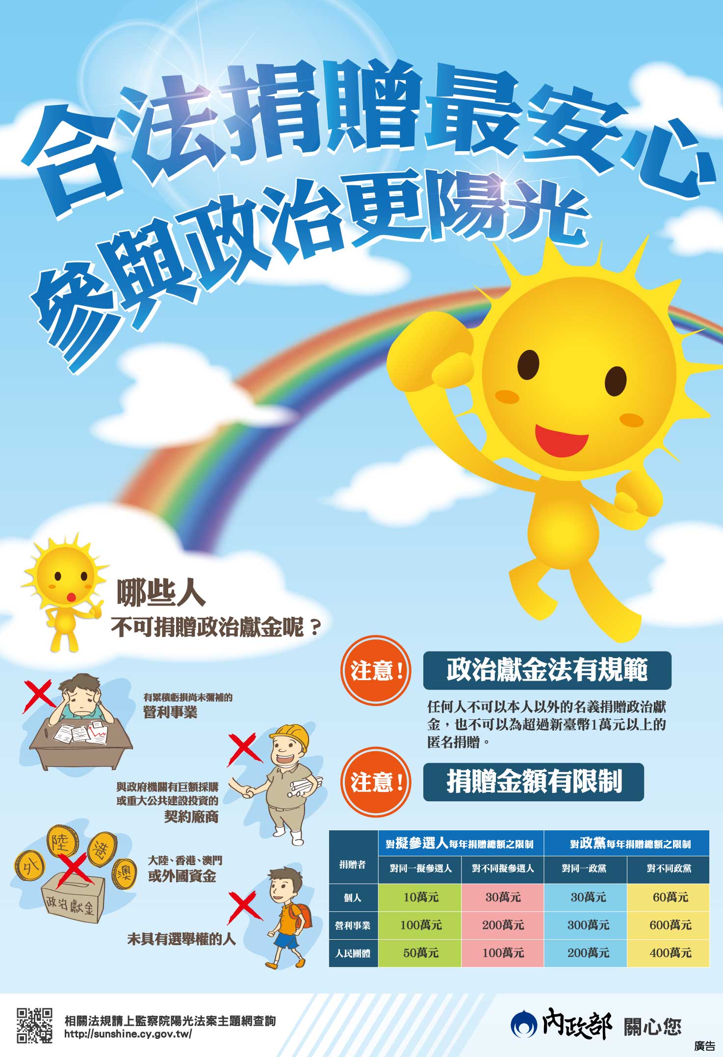 三、為加強宣導政治獻金制度,避免民眾未諳法律規定觸法而受處罰,於即日起至本年11月23日止協助辦理政治獻金法宣導,文稿建議文字為「個人對同一位候選人捐贈政治獻金,不能超過10萬元;對不同候選人捐贈,合計不能超過30萬元」、「營利事業對同一位候選人捐贈政治獻金,不能超過100萬元;對不同候選人捐贈,合計不能超過200萬元」、「有累積虧損尚未依規定彌補的營利事業,不能捐贈政治獻金」。