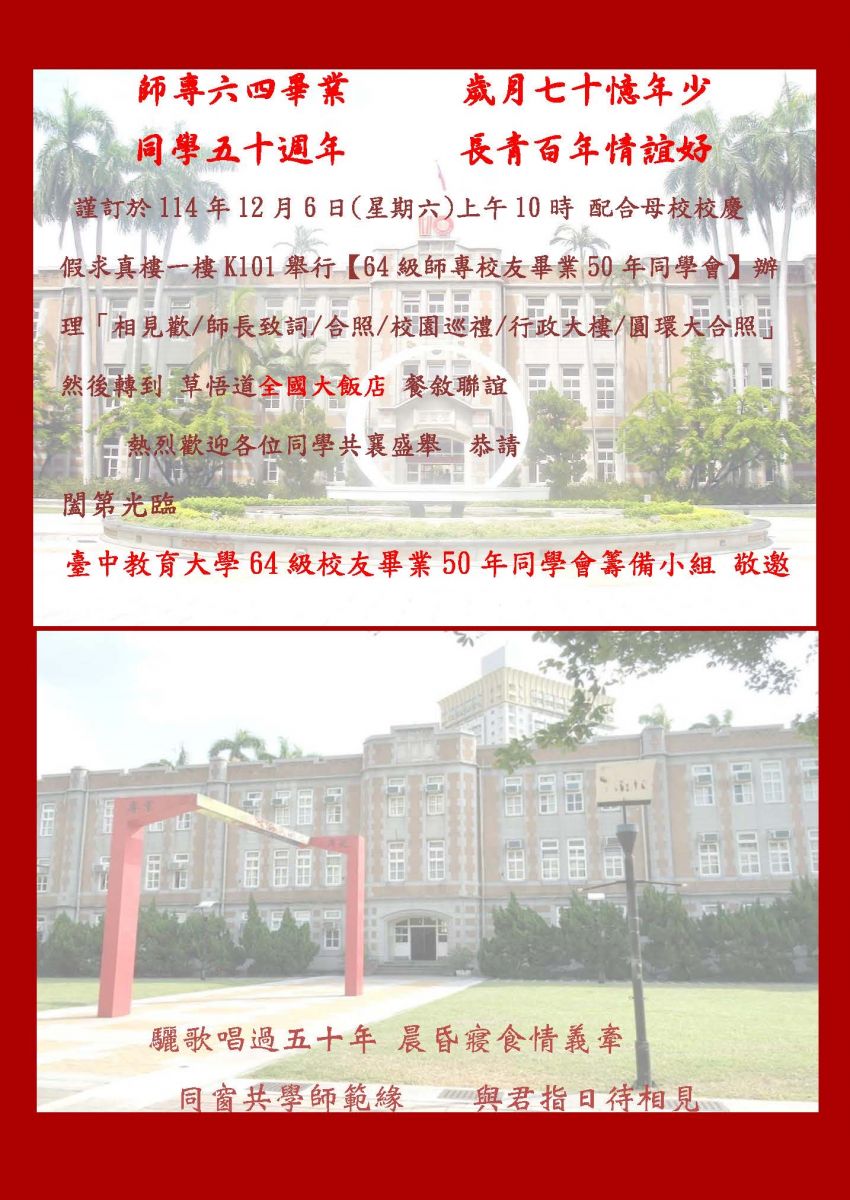 母校國立臺中教育大學前身(臺中師專)64級畢業50週年的同學會擇日於2025年12月6日校慶當天舉辦!